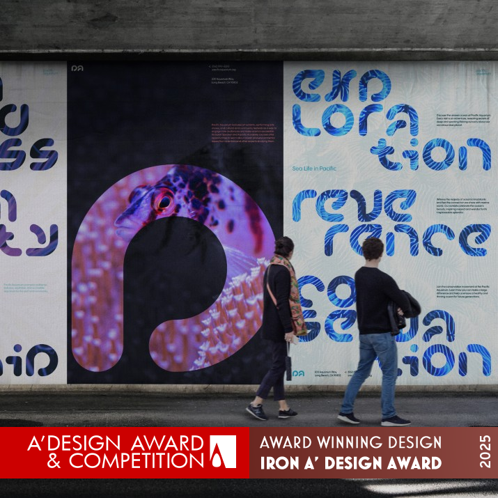 PRODUCTION / REALIZATION TECHNOLOGY: The design was inspired by the fluidity of the ocean, and translated into a custom modular font. The exhibition typeface was developed using generative design techniques to create symbols reflecting the urgency of ocean conservation. The design was applied across various media, ensuring visual coherence from small-scale digital assets to large-scale physical installations, providing a consistent identity for the Pacific Aquarium.