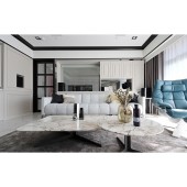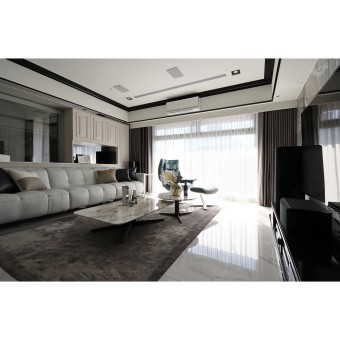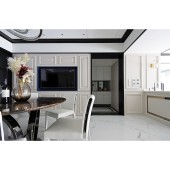 CHALLENGE: The greatest challenge was the junction of different materials and the design of hidden doors. Tiles and marble vary in thickness and weight, requiring precise adjustments and stainless steel edge trims for a refined finish. The hidden door and TV wall, made with slab tiles, posed weight-bearing concerns. To keep them flush and aligned, the designer meticulously adjusted the door hardware and supporting structures, preventing tilting from uneven weight distribution. These careful refinements ensured both aesthetic cohesion and structural integrity.