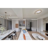 The highlight is the presentation of light and shadow. The color scheme is based on warm gray tones. When daylight illuminates the space, the visual effect is refreshing and warm. After sunset, the linear lighting and trims depict the softness of classical design.