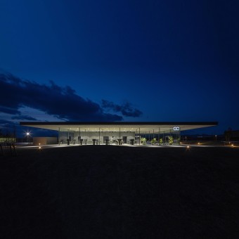 UNIQUE PROPERTIES / PROJECT DESCRIPTION: Located in northern Omura City, a rare flat area in Nagasaki, the site is rural, with Omura Bay to the west and the Tatara Mountains to the east. The design harmonizes with the landscape, bringing outdoor beauty inside. A 4m grid space with 75mm steel columns supports a cantilevered roof. The glass facade connects vehicle handovers to the scenery, while the contrast between the thick roof and thin columns creates a delicate, tense atmosphere.