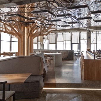 OPERATION / FLOW / INTERACTION: The interior was created taking into account changes in natural light throughout the day. In the morning it is filled with sunlight and becomes light, thanks to the reflective property of the metal ceiling, in the evening the reflection of the sunset fills it with its own shades, and at night the restaurant is immersed in a cozy atmosphere created by accent lighting and a variety of backlights that highlight the architecture and interior elements.