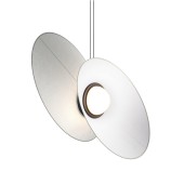 PRODUCTION / REALIZATION TECHNOLOGY: The lampshades are made of fabric with a metal frame. They are placed on a specially designed metal base with an ingenious attachment. This allows the lampshades to rotate 360 degrees, changing the design and lighting effects of the luminaire. The mounting allows the lampshades to be stable at any angle of inclination. The metal base contains high quality LEDs. They are covered with frosted acrylic diffusers to create a soft, pleasant light. The pendants are suspended on two metal cords, allowing users to adjust them to the desired position without twisting.
