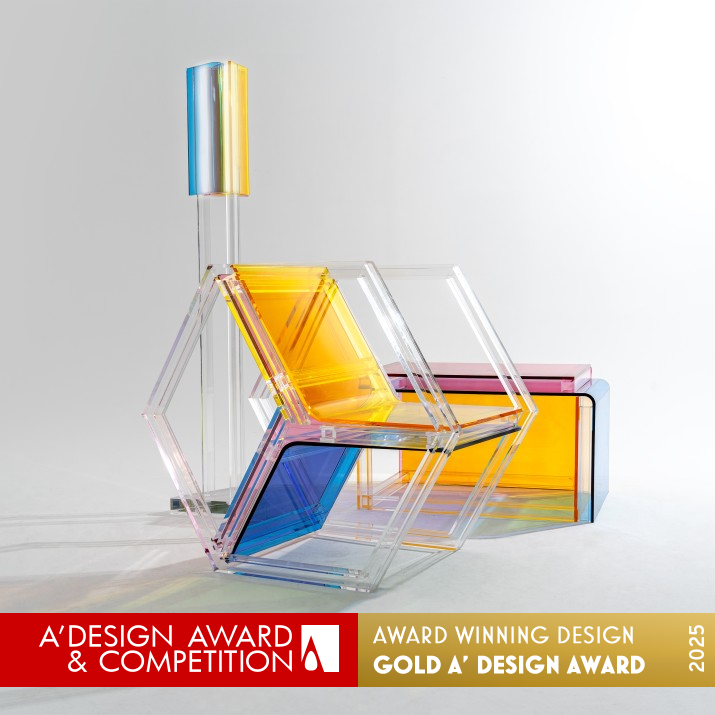 UNIQUE PROPERTIES / PROJECT DESCRIPTION: Color Roller is a furniture set that changes color combinations through rolling, using basic shapes and colors to create a unique spatial experience. Made from transparent acrylic, it displays varied colors under different lighting. Three acrylic panels intersect and overlap to form a vibrant palette. Minimally, the set features a hexagonal chair, rectangular table and triangular floor lamp. Users can flip and rearrange the pieces to personalize their space with dynamic color combinations.