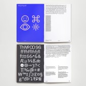SPECIFICATIONS / TECHNICAL PROPERTIES: The book is 120 pages, with the first section demonstrating the robustness of the font in use, the back pages are dedicated to the individual weights and glyphs.