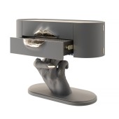 INSPIRATION: The design of Curious is rooted in the observation of a young woman whose charm and inquisitiveness left a lasting impression. Her expressive features, particularly her lips, and the graceful gestures of her hands, inspired the console's form. The upward-pointing finger of the hand base reflects her contemplative nature, while the lips on the drawer fronts symbolize her alluring yet curious demeanor. This piece embodies the duality of strength and delicacy.