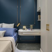 RESEARCH ABSTRACT: The bedroom is designed with ingenuity, using the colors that the owner personally likes when traveling. For example, the main wall of the master bedroom is navy blue with a metal frame, creating a unique British atmosphere, making the whole space full of vitality and exuding a gentlemanly demeanor.