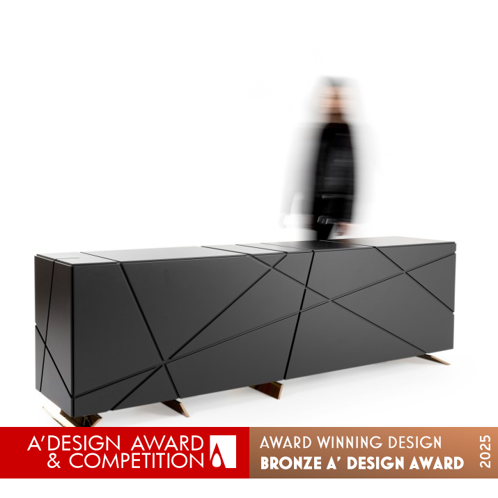The sideboard 'Tachi' stands out as a remarkable fusion of historical inspiration and contemporary aesthetics, masterfully encapsulating the elegance and dynamism reminiscent of medieval Japanese swords within the realm of furniture design. The sculptural interplay of intersecting lines and precise geometric patterns creates a captivating visual impact, enhanced further by the thoughtful use of lacquered wood and brass-coated metal legs that underline its sophisticated craftsmanship. Moreover, the innovative sliding door mechanism not only exemplifies meticulous attention to functional detail but also demonstrates a commendable dedication to resolving structural challenges while preserving visual harmony. This award-winning piece is undeniably an inspiring testament to thoughtful research, creative ingenuity, and exceptional execution in furniture design.