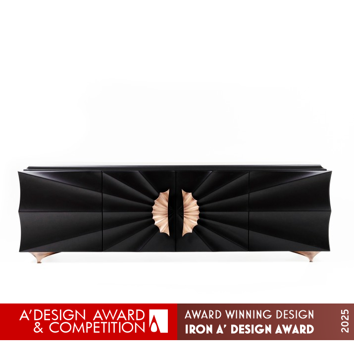 The award-winning sideboard titled "Wings" beautifully embodies a harmonious fusion of Gothic and Art Deco styles, showcasing an exceptional design vision through meticulously detailed craftsmanship and innovative techniques. The intricate copper wings elegantly engraved onto the dark-toned wooden surfaces evoke a profound sense of spirituality and sophistication, while the tapered metal legs add an impressive floating effect that further elevates the luxurious aesthetic of this furniture piece. Additionally, the thoughtful integration of symbolic meanings, representing humanity's continuous pursuit of freedom, progress, and celestial ideals, demonstrates a remarkable depth of creative inspiration. Furthermore, the careful consideration in material choice, precise CNC cutting combined with traditional handcrafting, and the ingenious invisible hinge mechanism collectively highlight a commitment to both aesthetic excellence and functional practicality, truly deserving of recognition in the Furniture Design category of the A' Design Award.