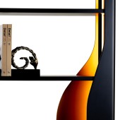 PRODUCTION / REALIZATION TECHNOLOGY: The Jazz Bookcase features an exterior body with a matte black lacquer finish and a special coating in copper color that deepens with light. cnc cut wood panels support fluid forms, while laser-cut metallic details complete the integrity. Integrated Led lights soften the light on the surface, creating a dimmed atmosphere. The shelving system perfectly balances functionality with aesthetics.