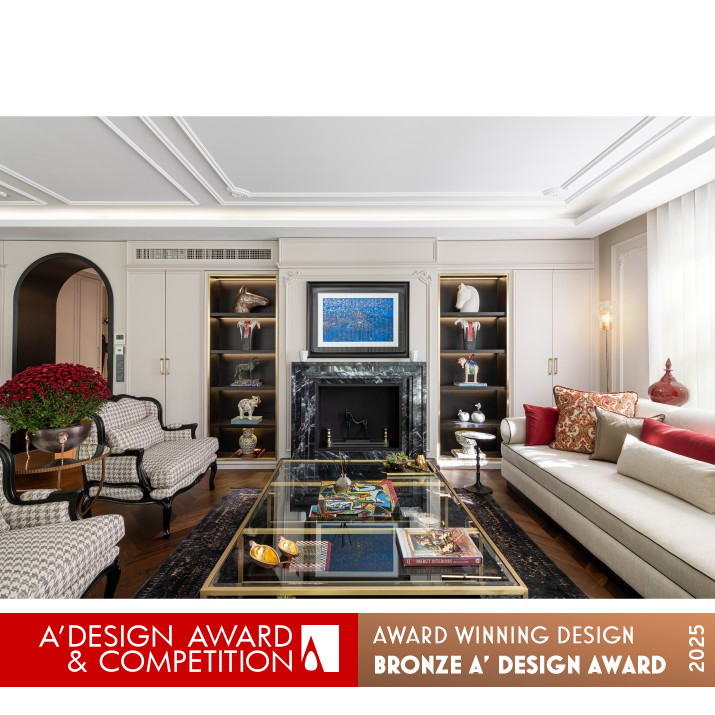 OPERATION / FLOW / INTERACTION: In the entrance, corridors, and bathrooms of the residence, black and white marble was employed for the flooring. The black marble on the entrance floor was utilized as both decoration and a border to introduce dynamism. In order to break the tranquility and stillness present in the corridors, black oval tags were chosen for the door transitions. In this manner, unity between the floor and walls was achieved, and by extending the black hue into the living room, overall harmony within the home was ensured. In the living room, a classical and elegant space was created through the use of marquetry parquet flooring, a marble fireplace, wainscoting on the walls, and crystal chandeliers, while the red chosen for the fabrics, accessories, and buffet imparted a dynamic and energetic effect.
