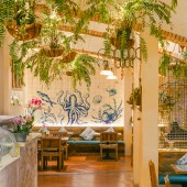 PRODUCTION / REALIZATION TECHNOLOGY: The restaurant interior design uses materials such as brick, rough plaster and zellige tiles to recall coastal Mediterranean architecture. These highly textural materials exude a hand crafted quality, complemented by blue and white hand drawn art evoking the warmth and familiarity of family meals at a grandparent’s home, those times when precious memories are made. The ambiance is bright, breezy, and inviting, with the open kitchen allowing for transparency of food preparation and the enticing aromas of pizza cooking to permeate and enhance the sensory experience.