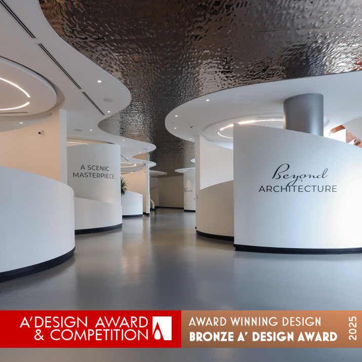 UNIQUE PROPERTIES / PROJECT DESCRIPTION: Rams Beyond Sales Office blends architecture and art in a gallery like space. Its all white interior, framed by a spider glass facade, enhances curated artworks and the building model. Curved forms and shadow play add depth, while a metallic gloss ceiling reflects light elegantly. This immersive showroom balances design, materiality, and storytelling, offering a refined experience that mirrors the essence of Rams Beyond Etro Residence.