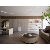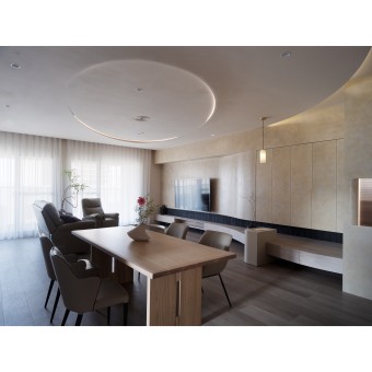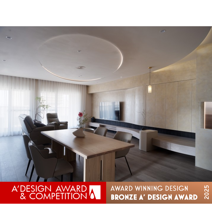 RESEARCH ABSTRACT: The continuous curves, layered materials, and interplay of light and shadow create a warm, narrative-rich atmosphere. The design transcends conventional frameworks, interpreting a philosophy of living where home becomes a comforting and stable presence. Curves connect different areas, ensuring cohesive flow, while the ceiling, reminiscent of a dawn horizon, filters soft light, symbolizing hope and tranquility. This design reflects both the present moment and the boundless possibilities of the future, giving tangible form to the emotional value of home.