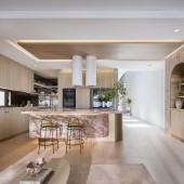 OPERATION / FLOW / INTERACTION: Ripple House enhances human experiences by fostering interaction and connectedness. The design actively encourages a sense of community and engagement, creating spaces that invite people to gather, converse, and connect with one another. At the heart of the home, a central void seamlessly connects the two levels, acting as a visual connector that enhances openness and fluidity while encouraging interaction between the levels. The kitchen is designed as both a culinary and social hub. The expansive chef’s island functions as a workspace and dining area, inviting family and guests to gather around food, creating an interactive cooking experience that fosters togetherness.