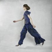 PRODUCTION / REALIZATION TECHNOLOGY: This two piece set, blouse and palazzo pants are made in iridescent silk chiffon overlay polyester satin body. Stripes of ruffles are individually cut and adorned with seed beads then hand sewn to palazzo pants. When in movement, the panels on the pants fly open, portraying a hopelessly in love fairy queen spinning and dancing and the little gold beads appear just as many little fairies accompanying the love sick queen. The lightness of silk chiffon render Titania's graceful and sentimental charm.