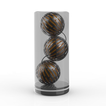 PRODUCTION / REALIZATION TECHNOLOGY: Produced with precision laser cutting techniques, the patterned metal orbs achieve consistency and optimal light diffusion. The glass casing is molded to exacting standards, maintaining clarity while boosting the interplay between light and shadow within the structure. The spheres are precisely fitted within the glass container, ensuring they remain stable and secure even when it is shaken or moved.
