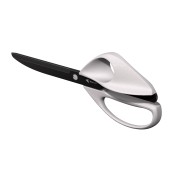 UNIQUE PROPERTIES / PROJECT DESCRIPTION: Vector Scissors introduce a unique blade and handle design that helps users achieve precise, straight cuts more easily. By pressing the ergonomic handle against the edge of a table, both the blades and the user's hand are stabilized. This allows the user to keep the blades fixed while sliding them forward during cutting. The table edge serves as a natural guide, ensuring a straight and controlled cut with minimal effort.