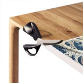 OPERATION / FLOW / INTERACTION: Vector functions like any traditional pair of scissors but offers an additional guided cutting method for improved precision. When used normally, it performs like standard scissors for everyday cutting tasks. For guided straight cuts, users can press the handle against the edge of a table, stabilizing both their hand and the blades. This allows the scissors to slide forward in a straight path, using the table edge as a guide, making precise cuts effortless along the entire length of the table.