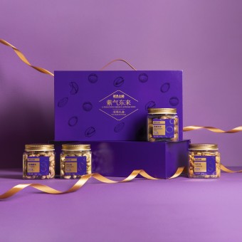 UNIQUE PROPERTIES / PROJECT DESCRIPTION: The nuts gift package uses purple as the main color of the gift box, purple has been the favourite colour of emperors since ancient times, symbolising wealth and splendour. They are often used to hope for a prosperous and promising life. It is matched with coin patterns to symbolize the auspicious meaning of the gift box.