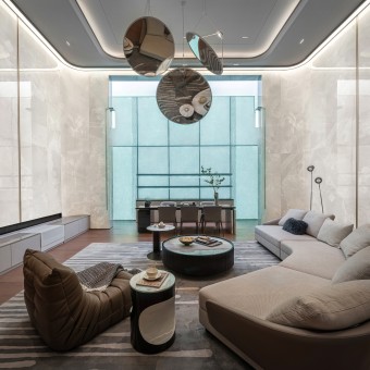 The interior design emphasizes environmental consciousness and sustainability, utilizing high-quality materials such as blue jade glass, light-colored jade stone, white leather, and Hermes gold marble. These elements balance a sense of understated luxury with durability. Blue jade glass is eco-friendly, recyclable, waterproof, and corrosion-resistant, offering repairability to reduce resource waste. Thoughtful material selection and construction methods create a healthy and green living space for the residents.