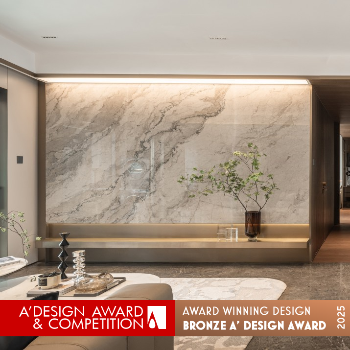 SPECIFICATIONS / TECHNICAL PROPERTIES: The living room’s feature wall is made of marble, measuring 1000mm x 18mm x 1900mm . The large-scale stone design enhances the grandeur of the space, conveying a sense of luxury. The construction technique uses a dry-hanging method, where a steel frame is welded to the wall and stone slabs are hung with brackets, ensuring that the marble can be recycled during deconstruction, in line with sustainable development principles.