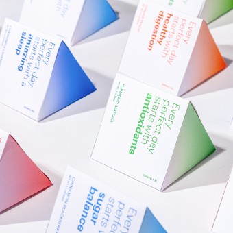 UNIQUE PROPERTIES / PROJECT DESCRIPTION: This redesign of Bigelow Tea packaging enhances both aesthetics and functionality. Bold typography highlights each tea’s benefits, while dynamic gradients differentiate flavors within a cohesive system. Each tea comes in a triangular box, which interlocks into a striking hexagonal form, strengthening shelf presence and user engagement. This modular, interactive design elevates the tea experience, blending visual appeal with practical innovation.