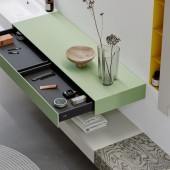 OPERATION / FLOW / INTERACTION: Dodici is a modular bathroom furniture collection that offers functionality and comfort. Its natural veneer and lacquered surface modules come in 1200 and 1400 mm length options, adapting to different spaces. The sensor-activated LED mirror provides practical use with touch control, while the anti-fog feature ensures a clear view at all times. Fully extendable soft-close drawers offer a quiet and comfortable experience, and the leather-lined interiors create a refined tactile feel. The hygienic acrylic washbasin is easy to clean and user-friendly.