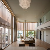 On the fourth floor, a double-height living space provides an expansive view of the cityscape, enhancing the sense of openness within the residence.