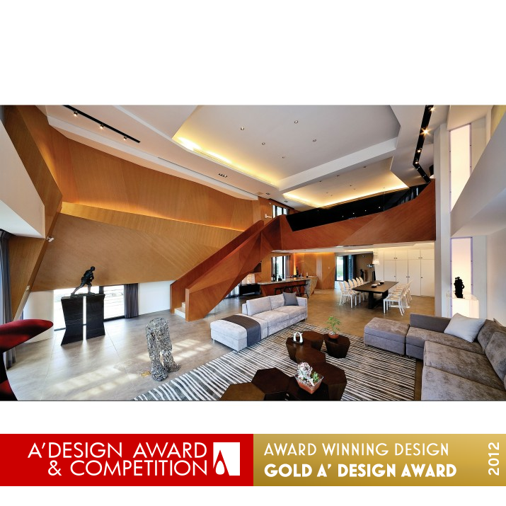 Split-level type of structure and main staircase are in the middle of interior space, while the left and right sides are split-level staircases, so a total of five different indoor staircase area connecting the space.