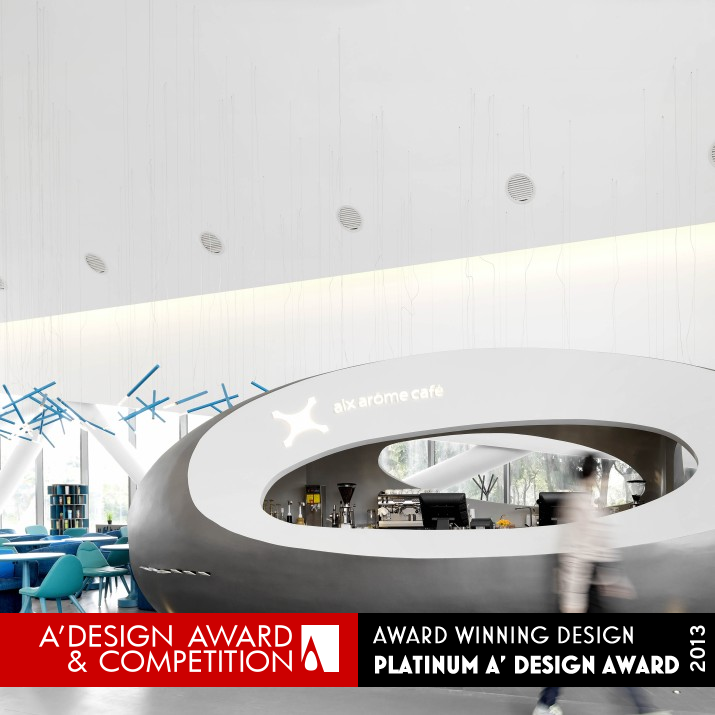 OPERATION / FLOW / INTERACTION: Located in Shenzhen Bay OCT Harbour Theme Park, blue and green color scheme represent the ocean theme. Huge gray egg- shaped cashier and water bar implies the characteristic of coffee bean which seems bitter but tasty. Furniture with various organic appearance present vibrant mood into the interior. The seemingly randomly hanging blue chandeliers resemble shiny ripples absorb cozy sunlight from the sky. Coexistence of beauty and functionalism has been emphasized in the ocean of mind.