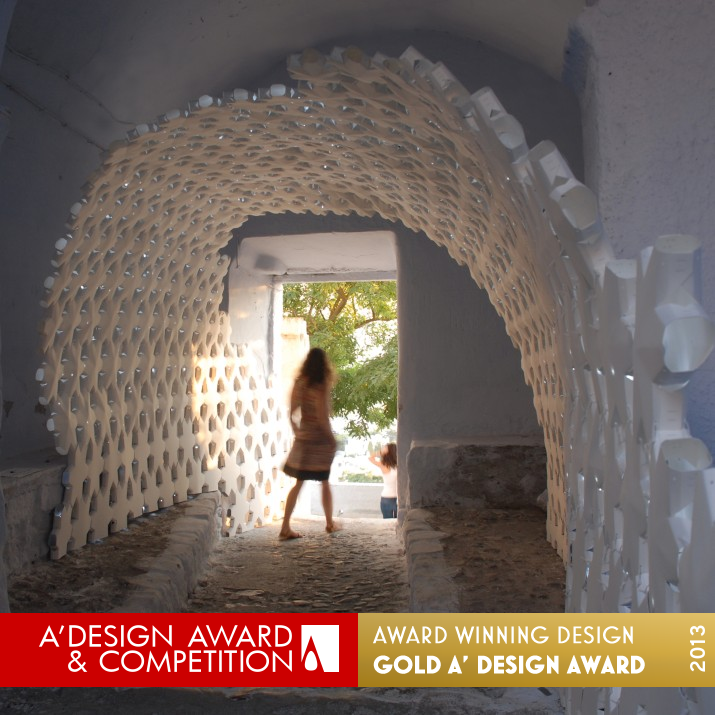 These flat-packed materials were assembled at site, linked with each other by zip-ties and situated within the existing tunnel space. String LED lights were installed within the panels so that the tunnel space got brightly lit and could be accessed by nighttime visitors to Kasteli and nearby tavernas.