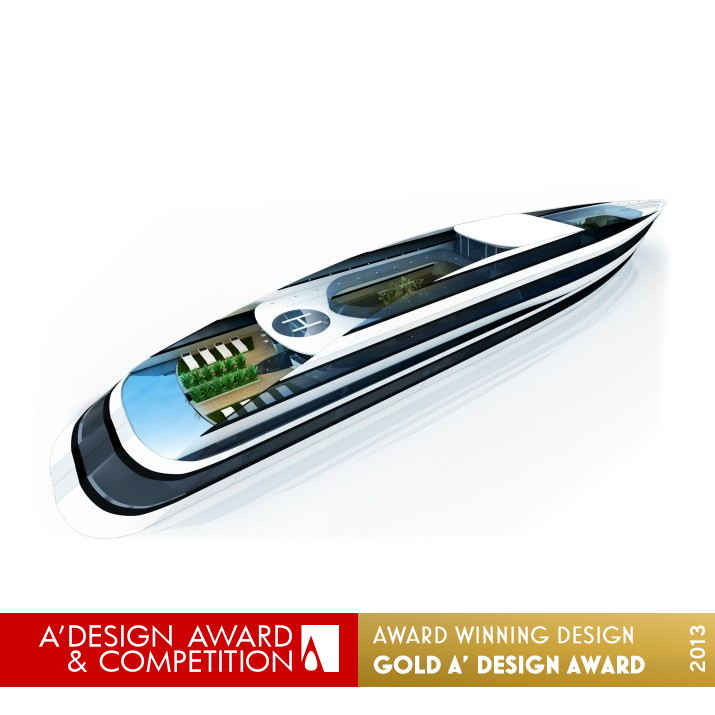 INSPIRATION: Inspired by an atrium house, this 73 meter long yacht concept has 2 courtyards. The target was a new experience of space on a motor yacht. The concept does not track the rational and perhaps optimal use of every square meter, but wants to approach to architectural parameters like the interplay of spaces, openings and visibility.
