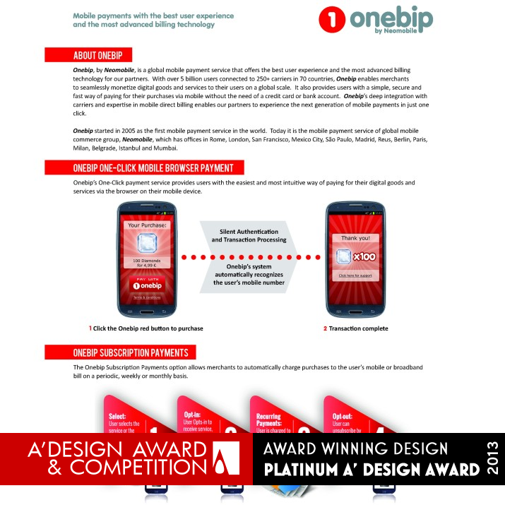UNIQUE PROPERTIES / PROJECT DESCRIPTION: Onebip one click payment service provides users with the easiest and most intuitive way of paying for their goods and services via the browser or inside an application on their mobile device. The service automatically recognizes the user’s mobile number and charges the purchase to their mobile bill or deducts it from their pre-paid credit in just one click.