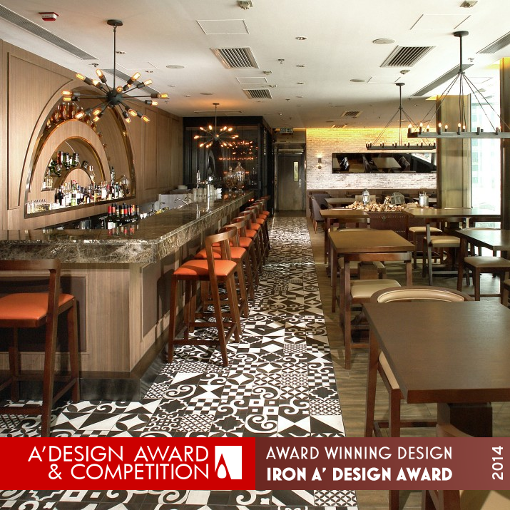 UNIQUE PROPERTIES / PROJECT DESCRIPTION: Located in the living heart of Central,Hong Kong, Liberty Exchange are designed to reflect the vibrant lifestyle of "Hongkongers" - a place that is worthy for relaxation during happy hours or throw parties at special occasions. The two stories gastropub are divided into two area: open bar on ground floor are informal space for quick bites and drinks, at top floor, the area are design for fine dinning in a casual way. The vintage travel theme on top floor is the highlight in Liberty Exchange with single pedestal table match with leather chairs or leather trunks as decoration to create a sense of turn-of-the-century experience. To soften the vintage look, dynamic floor tiles with various patterns are floored to retain the fun and casualness from open bar. The backdrop inspired by old clock at New York grand train station is mounted to juxtaposed with the floor tiles.