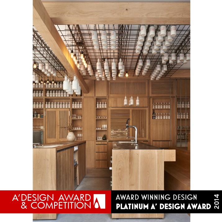 The bar interior, designed by Fabian A. Wagner of Buero Wagner and Andreas Kreft, is a clear continuation of this philosophy – looking for new configurations whilst paying a tribute to the local Bavarian culture and craftsmanship. The ambience of a Bavarian beer hall has been applied to the 40m² interior through amphitheater-style benches against opposing walls thus eliminating the common separation of bartender and guest. Here interaction is key and everybody has a first row seat. From either tribune guests enjoy a view onto the two centrally placed bars and follow how Bax and his team mix, shake and stir up the cocktails. Also the bars have been stripped of all boundaries: workspace and bar are one. Dried flowers, herbs and leaves are stored and displayed in a wooden built-in cupboard that stretches the full length of the back wall; Besides ingredients, also the coffee machine and even the doors to the bathrooms and laboratory are seamlessly integrated and can be flexibly displayed or disguised behind lattices. Tribunes, bars and cupboards are made of solid oak with a natural oil finish. White ceramic bottles, containing self-made liqueurs, syrups and essences, are suspended from a black steel mesh attached to the ceiling. In-between light bulbs make for a reduced lighting scheme by night.