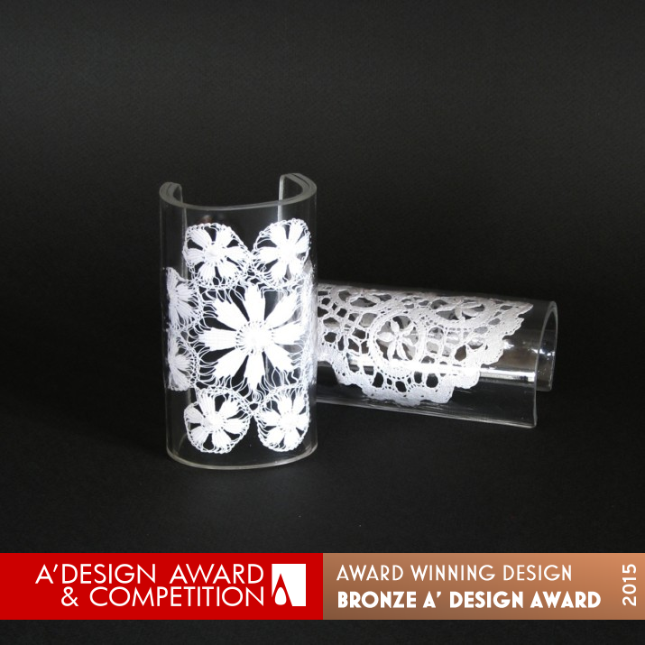 CHALLENGE: Since PMMA has to be heated in order to be bent, the most challenging part was how to heat it without burning the delicate threads of needlework and then how to connect the lace and the Plexiglas without the glue.