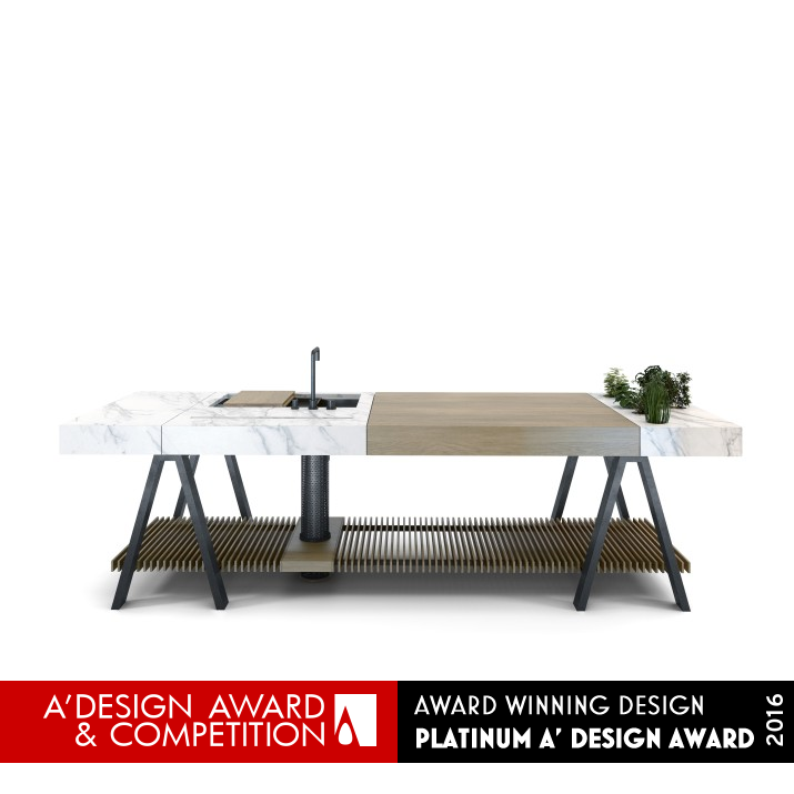 UNIQUE PROPERTIES / PROJECT DESCRIPTION: Banco redefines the kitchen table, improving its performance, transforming it into a tool. A furniture system integrated with worktops designed for different purposes that each user can adapt to their needs.