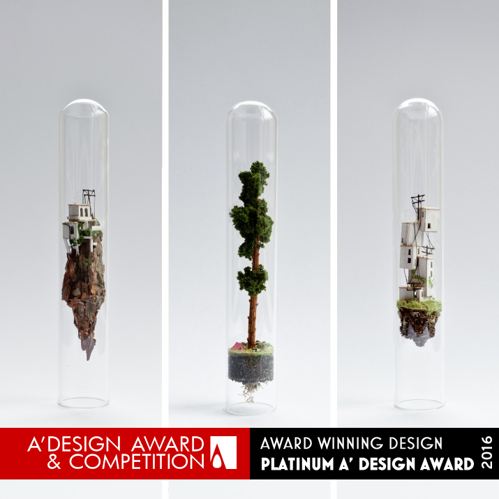 UNIQUE PROPERTIES / PROJECT DESCRIPTION: Micro Matter consist of a series of miniature worlds floating inside upside down glass test tubes. Towering houses, sky scrapers, campsites and a water tower, each sculpture inspires the next. All pieces are handmade and of every world there is only one.