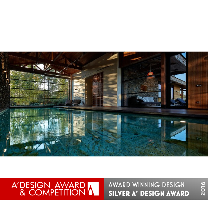 PRODUCTION / REALIZATION TECHNOLOGY: Trusses of the ridgy roof of the house, as well as the bearing pads, are made of the laminated beam. The walls are made of dark-green schist with embedment of the mortar. The roof is shingled with larch. The inside-pool deck is reveted with Juparana Tiger granite. The water column creates the illusion of the pool deck being carved out in a cliff. The open swimming pool is made of polished stainless steel. The pool edge is lowered and planted with mountain pines. The water sparkles like a forest stream.