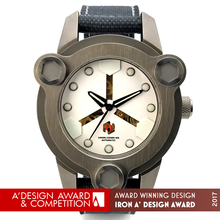 PRODUCTION / REALIZATION TECHNOLOGY: NBS' details represent the solid construction of the nuclear fusion reactor. The tri-sectional design has a bold futuristic appearance. The dial is modeled on the nuclear fusion reactor’s core. The robust casing and the three main screws resemble the strong image of the plant. The metal buckle and loop reinforces the masculine image, and also help balancing the watch's weight. The bottom cover looks like a safety vault door. It can be worn comfortably because of the carefully designed bottom.