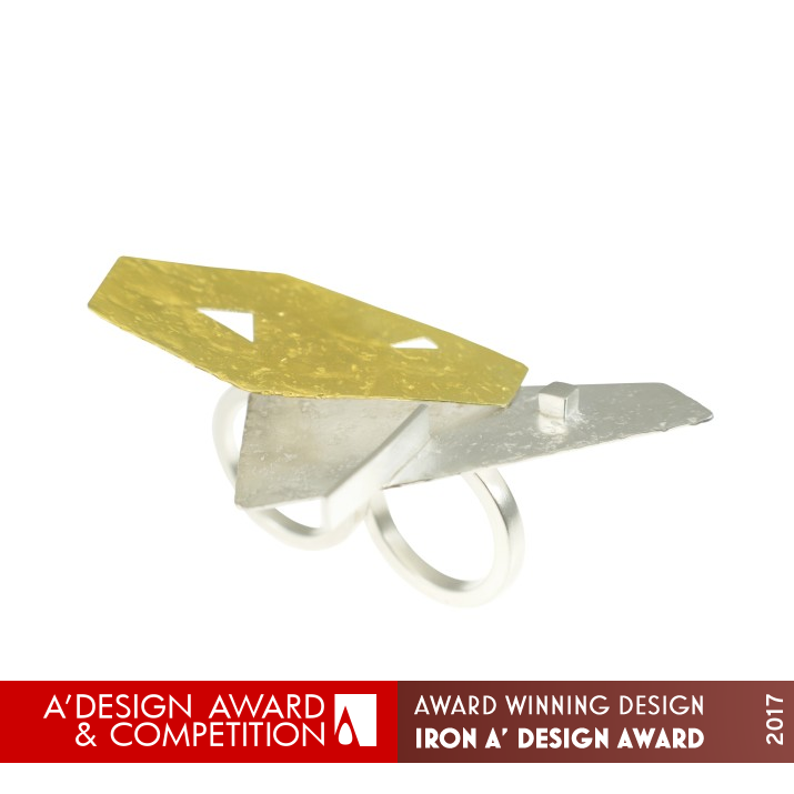 UNIQUE PROPERTIES / PROJECT DESCRIPTION: Triumph door is a one of a kind ring made of Argentium Silver 935 and 22K bi-metal sheets. It consist of two soldered planes overlapping one another. The planes seem to float over three fingers while they move to the rhythm of the hand. The combination of colors and the texture of the planes make a beautiful contrast with the softness and length of the fingers. The metal is hand textured to make it look more organic and warm while the two rings are highly polish for comfort and contrast. A world of triumphant is a winning world.
