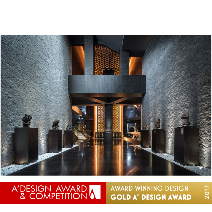 PRODUCTION / REALIZATION TECHNOLOGY: Volcanic rocks only found in Hainan line the lobby walls, while the floors feature highly reflective Mongolian black marbles to create an inverted effect. Evocative displays conjure images of a deep sea cave: stone lion statues unique to the Ming and Qing dynasties, and ancient ebony found in a sunken ship awaken the visitor's sense of wanderlust as they are led through the lobby. In B1, the various function rooms are harmonized by a low-cost smoky oak grille featuring an elaborative Sanhualiuwan design that can be found in the buildings of the Forbidden City. The function rooms are reconciled while invoking the Chinese legacy.