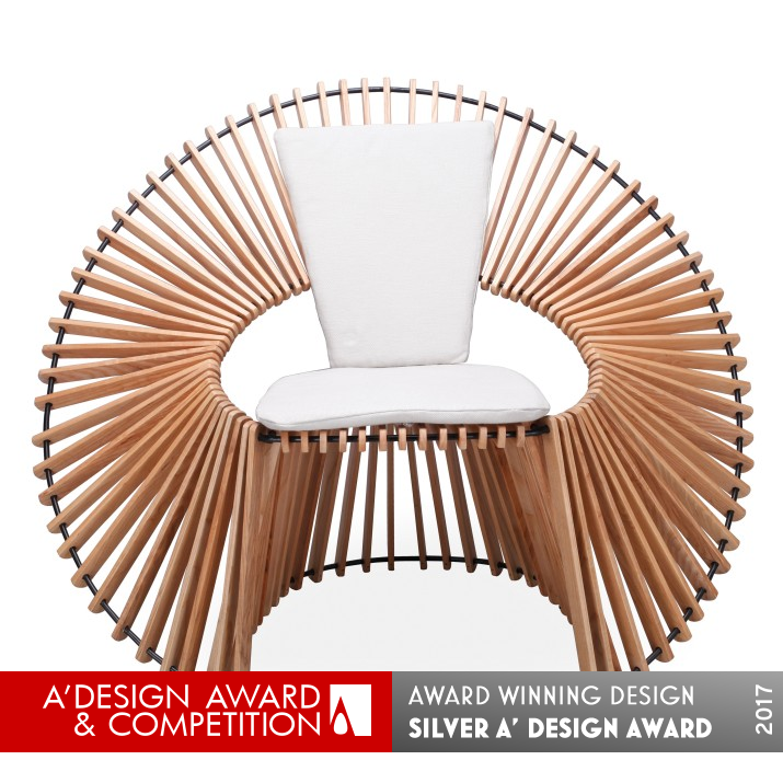 UNIQUE PROPERTIES / PROJECT DESCRIPTION: Ash wood slats were meticulously placed in a radial array, supported by two worn black iron bars and screws to complete the form and function of Julia. Each material was carefully thought of, measured and calculated - the number and sizes of each wood slat, the gaps in between, the distance between the inner and outer bars, and even the holes on the slats. In addition, the clean look and thinness of the cushion compliments Julia and even without it, it is still able to maintain its comfort and solid stance.