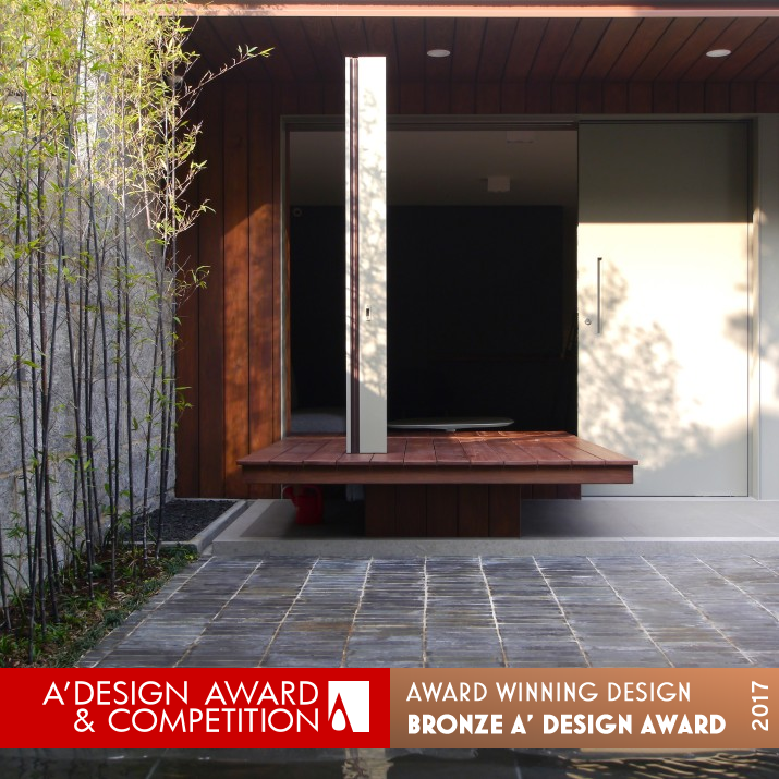 OPERATION / FLOW / INTERACTION: On arrival, the carved stone that appears at the vanishing point sits in the open and also functions as a tea table looking to the sea and sky. A bare concrete wall stretches horizontally from the stone to the water to form an extended view that can be appreciated from the timber deck. The silhouette of the surrounding greeneries is reflected on the water surface, which also emits the sound of flowing water. At the connection between the unit and the terrace, the covered deck is positioned to provide a semi-open place that connects with nature, where one can meditate and a group can gather. The deck forms an aperture with the entrance portal to further the scene to the kitchen at the deep end of the interior.