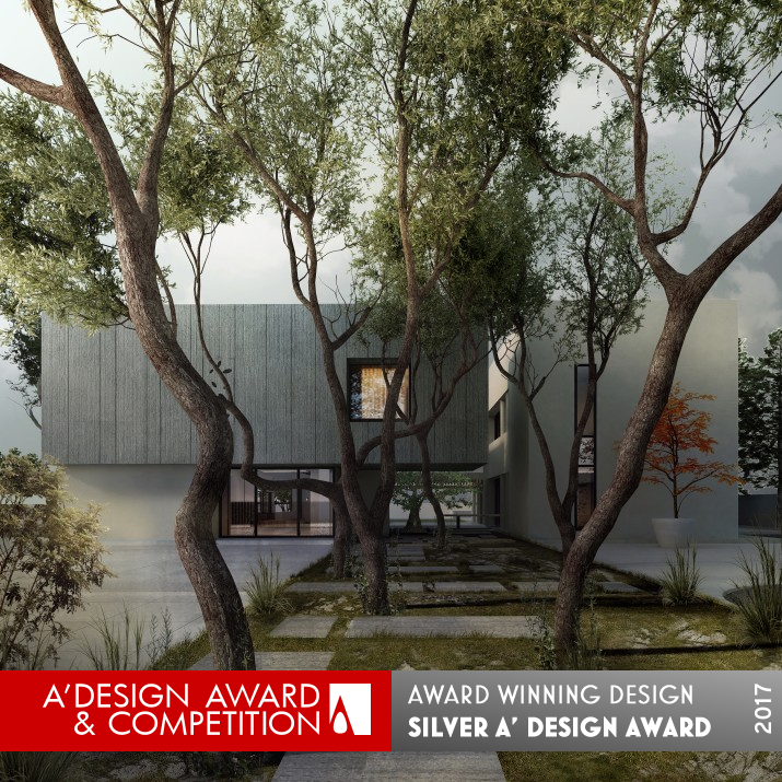 PRODUCTION / REALIZATION TECHNOLOGY: The house’s masses are clear, different in texture and oriented to create a central courtyard. A cantilevered mass is connected with another mass through a skylight on the ceiling of the 1st floor which brings the nature light into the house. Other masses are connected through the pivoting wooden screen bridge. Simple, earthy palette of materials, concrete, steel, wood, and glass that blend strongly with the simple modern design are used merging the house into its landscape with its rocky land.