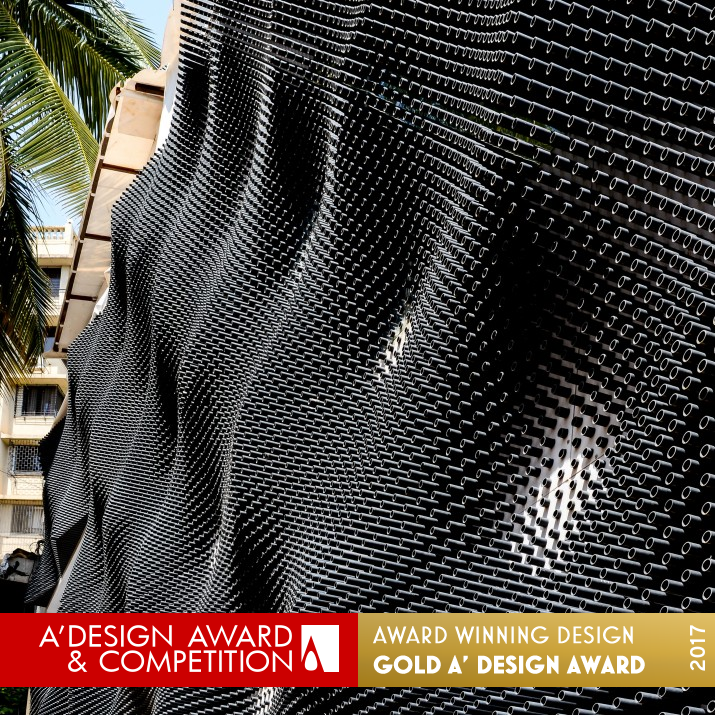 PRODUCTION / REALIZATION TECHNOLOGY: Re-use / Re-cycle : The dynamic skin, all of 25,992 black recycled cylindrical conduits were grafted into CNC aluminium composite box panels with acupuncture-like precision. The interior seating systems, furniture were recycled as well. The suspended light fixtures were cast in recycled plastic bottles.
