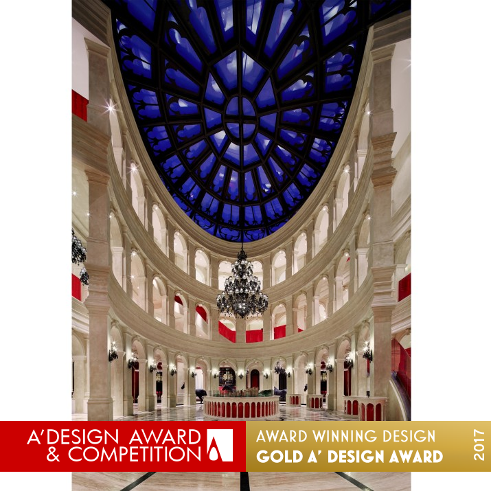 PRODUCTION / REALIZATION TECHNOLOGY: Through the metaphor of featured language forming a multiple space by deformation, transplantation and collage of historical symbols. 14m high central void possesses the symbolic silhouette of European architectural civilization with a building model surrounded by multi-functional area. Designers applied music as carrier of emotion and curvy features with bold and unrestrained reverie as design language to have notes run through the entire space by lighting experiencing the flow of modern space.