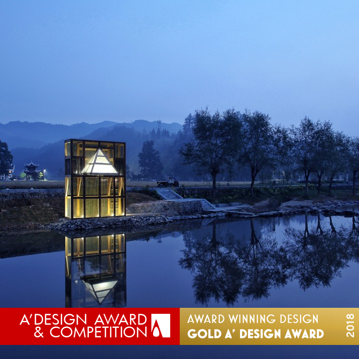 After getting dark, the shelter shows an utterly different presence from the daytime. The overall shape of the structure merges into the darkness and the pyramid emerges together with its mirror images, seemingly floating in the air with its reflection in the water. Hence, an imagery of the Lonely Islet is brought in the air of Longli’s most natural and original scene.