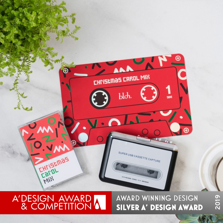 PRODUCTION / REALIZATION TECHNOLOGY: The whole Christmas carol theme was realized when we were able to secure cases of cassette tape players and blank cassette tapes. From there just like the old days, we recorded mix Christmas songs to cassette tapes one by one. We created a custom cardboard box design with hologram foil to hold the set, design a sleeve for the cassette tape box, and design a cassette tape-like Christmas card with hologram foil to complete the look.