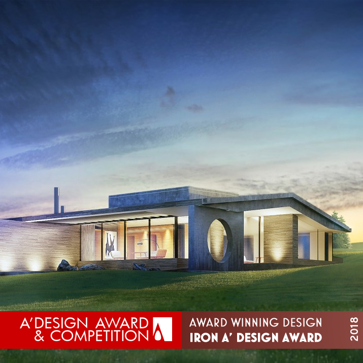 OPERATION / FLOW / INTERACTION: The single storey bungalow follows the natural topography lines of the site. Each space offers a carefully arranged view over the magnificent landscape of rolling hills and the nearby forest. An open space concept of living, kitchen and dining defines the southern side of the house. Bedroom, studio and study room are unfolding towards the East and the North under one enormous roof. A cubic dormer offers a family room framing the horizon behind a gentle hill towards the sunset.
